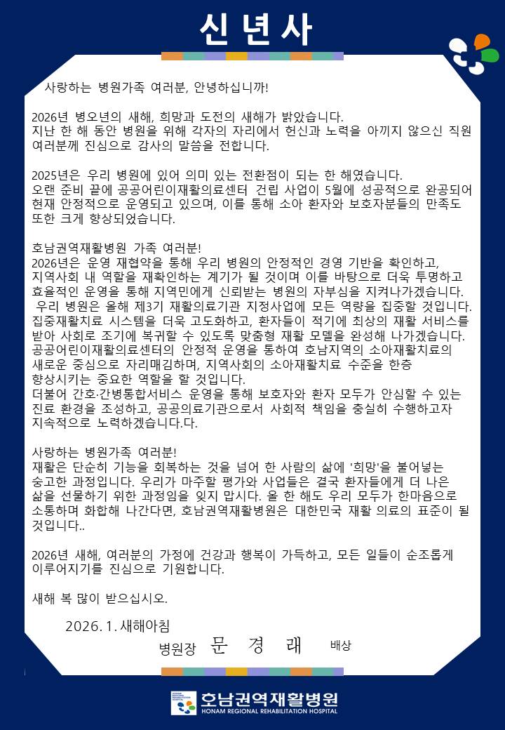 2026년 신년사 페이지 정보 작성자 행정관리팀 박승재 댓글 0건 조회 302회 작성일 26-01-02 08:58 목록 본문 2026년 신년사 목록 다음글 2025년 환자안전 및 감염관리의날 행사 25.12.24