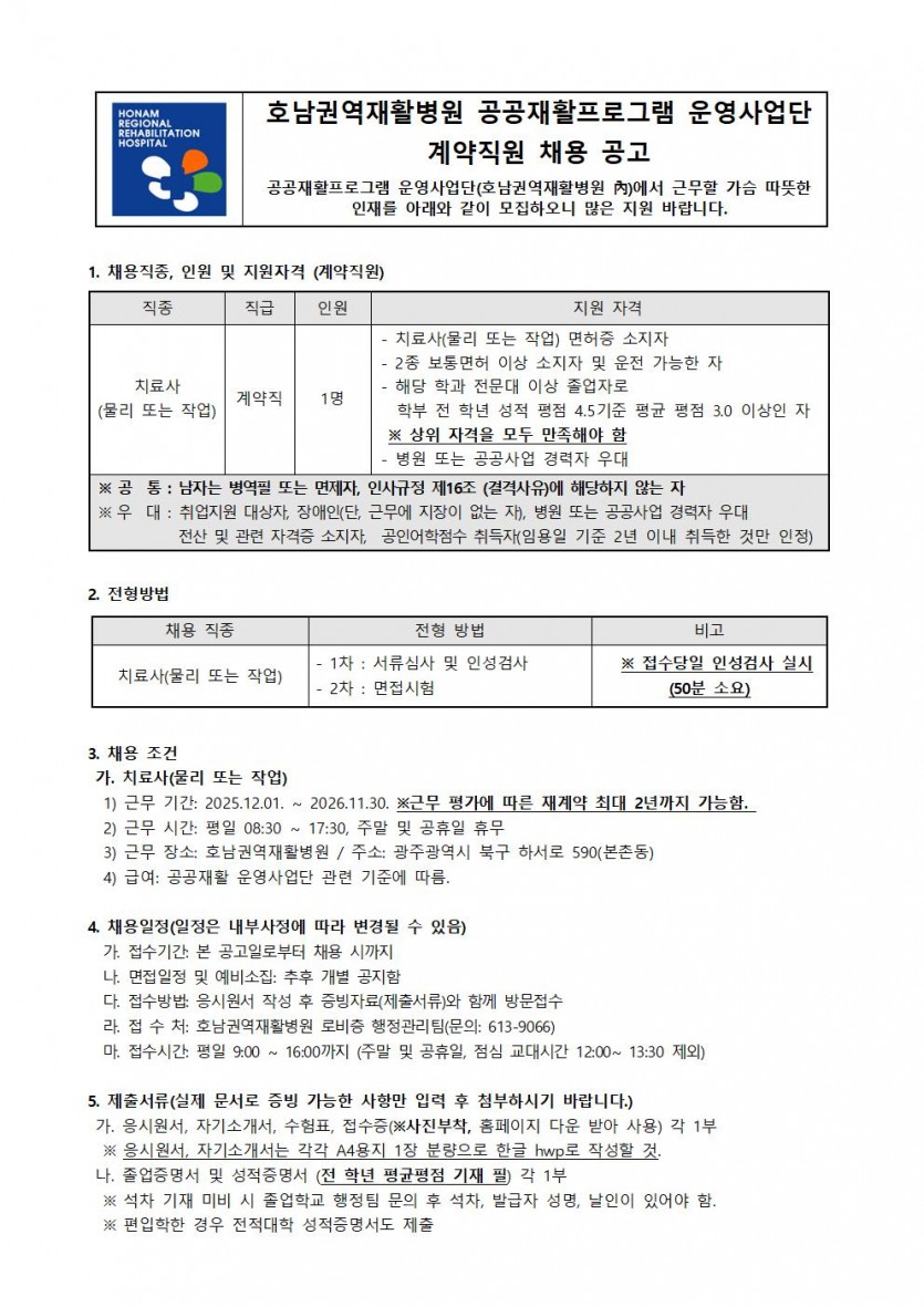 - 공공재활사업단 계약직 치료사 1차 합격자 발표 및 진행 일정